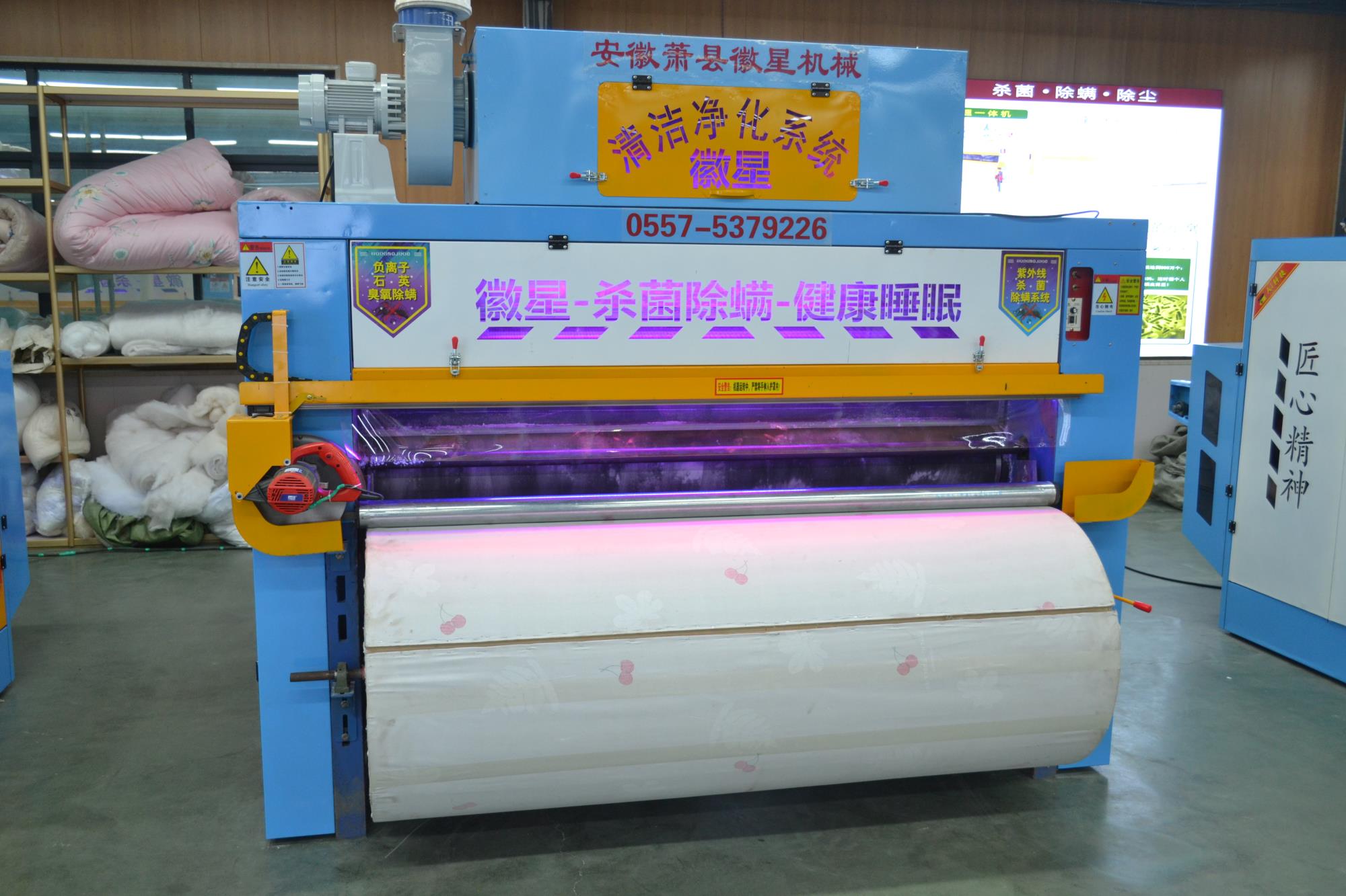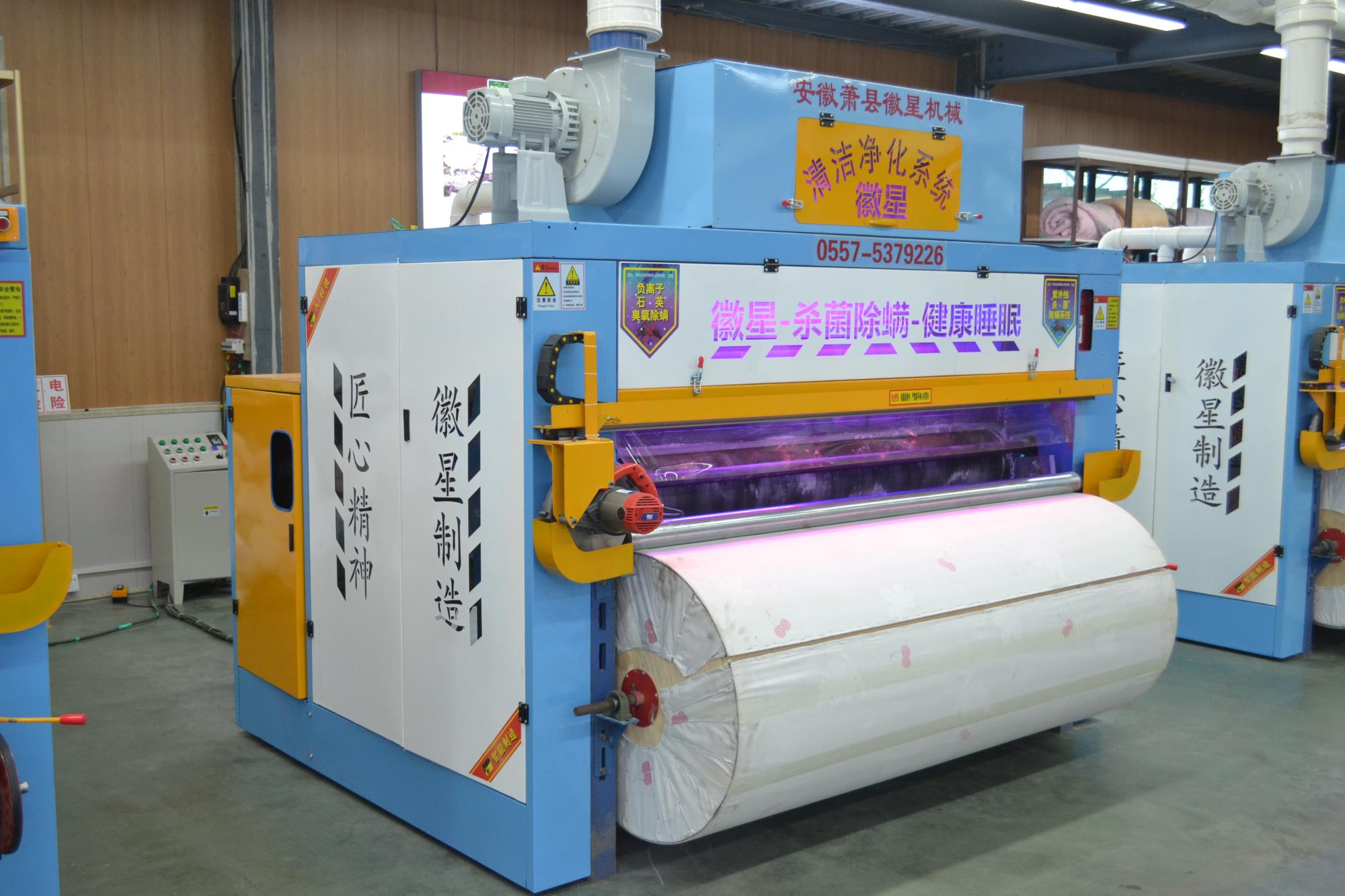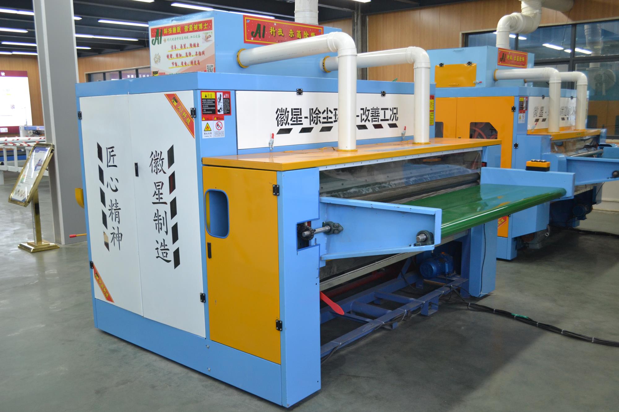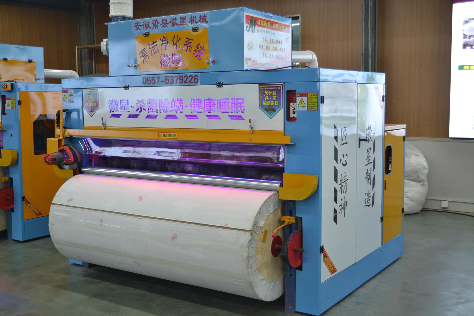 產品簡介:彈花梳理一體機高配款,可對棉被寬度自由調節,為對用戶的生產帶來了方便,大功率排風機,高效的吸除落棉、飛花和粉塵的裝置改善了勞動環境減少了紗疵該機排雜性能良好。彈花梳理一體機高配款已向優質、高產、低耗的方向發展,機流程簡單易學,分體控制柜,按鍵一鍵啟動,雙側羅拉采用全封閉設計,防纏繞,不塞棉,不藏灰,低噪音,錫林工作輥采用上市公司原材,該機可隔機安全觀察,開松四羅拉不抽花,雙雜亂。它配有雙吸塵系統,除去棉花中的粉塵以及短絨,同時改善了工作環境。該機可對各種纖維、棉花、羊毛、駝絨、等原料開松梳理,是生產棉被、羊絨被、絲綿被的機械。